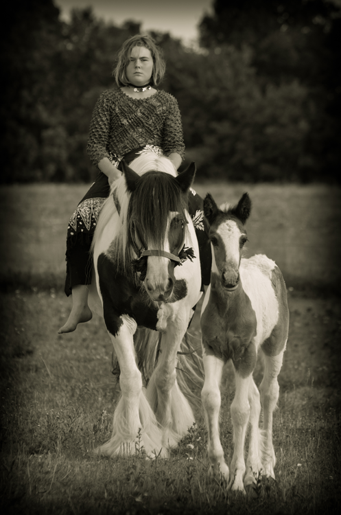 The narrow lane was flanked by a tall overgrown hedgerow, giving way, ever so often, to a rusty metal gate offering a glimpse of what lay beyond. We had driven this way many times, but today was different. We were surprised to see thirty or more small black and white mares with foals in one of the hidden fields. Our little car was slipped into reverse and once stopped we found ourselves face to face with some of the most inquisitive, colorful creatures. They had come to the gate for thier own investigation! This moment was the beginning of a journey with the small drafty horse locally known as the Gypsy's coloured ponies whose sole job was to pull the family's living wagon (Vardo) and worldly goods. We had seen them on the verge of the motorways and in the village, but this time our interest was caught by sheer number present at the gate. Before we had even packed the cottage in preparation to moving back to the States, we were making arrangements to purchase and transport three yearlings.